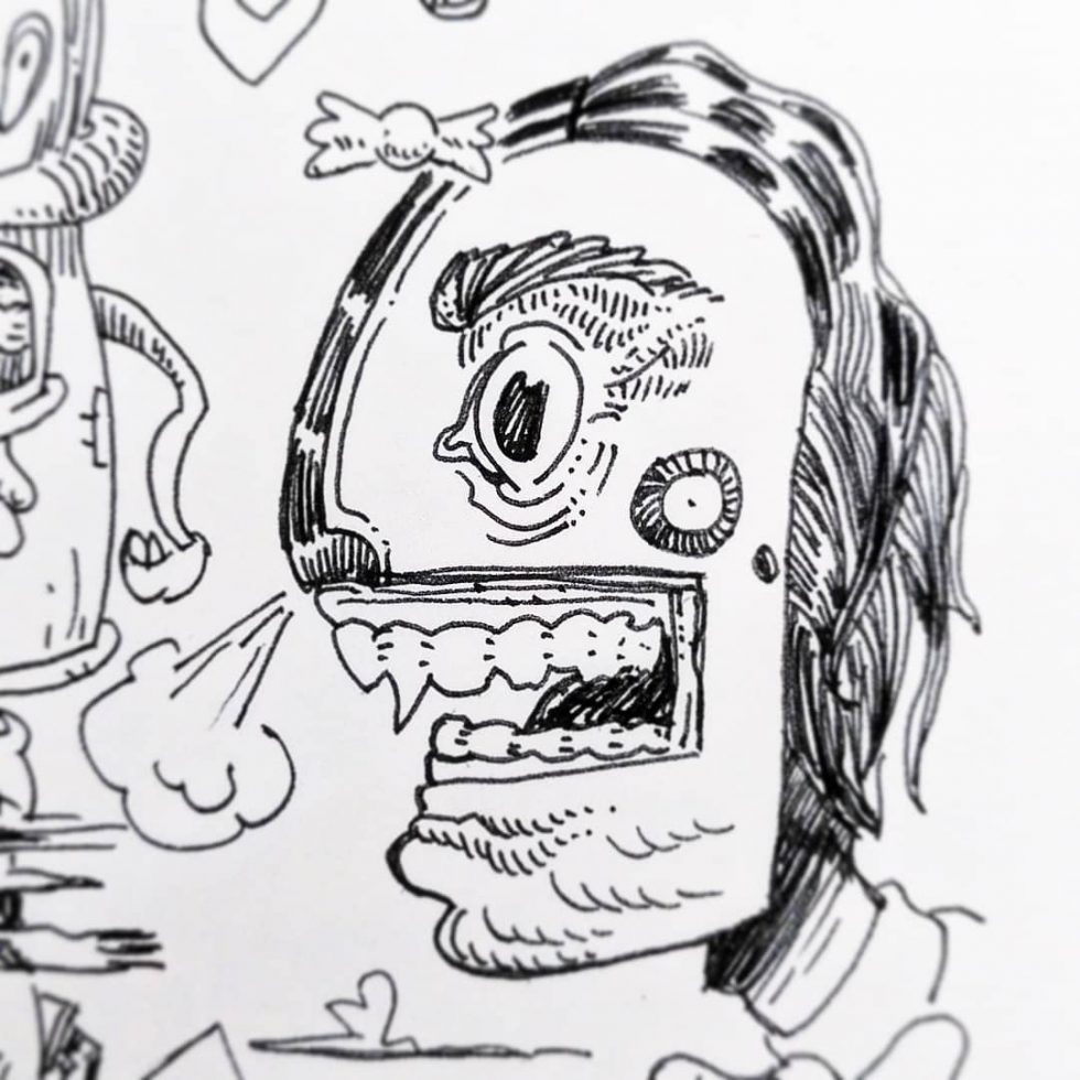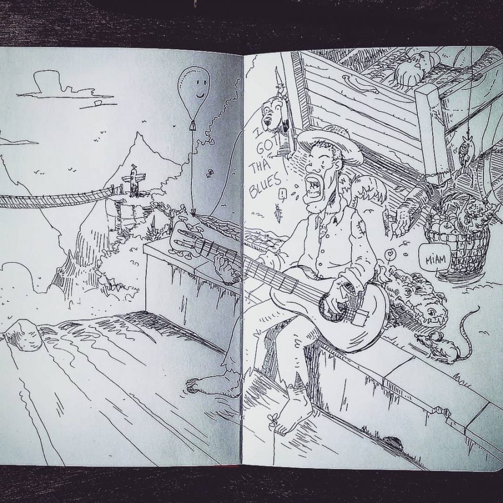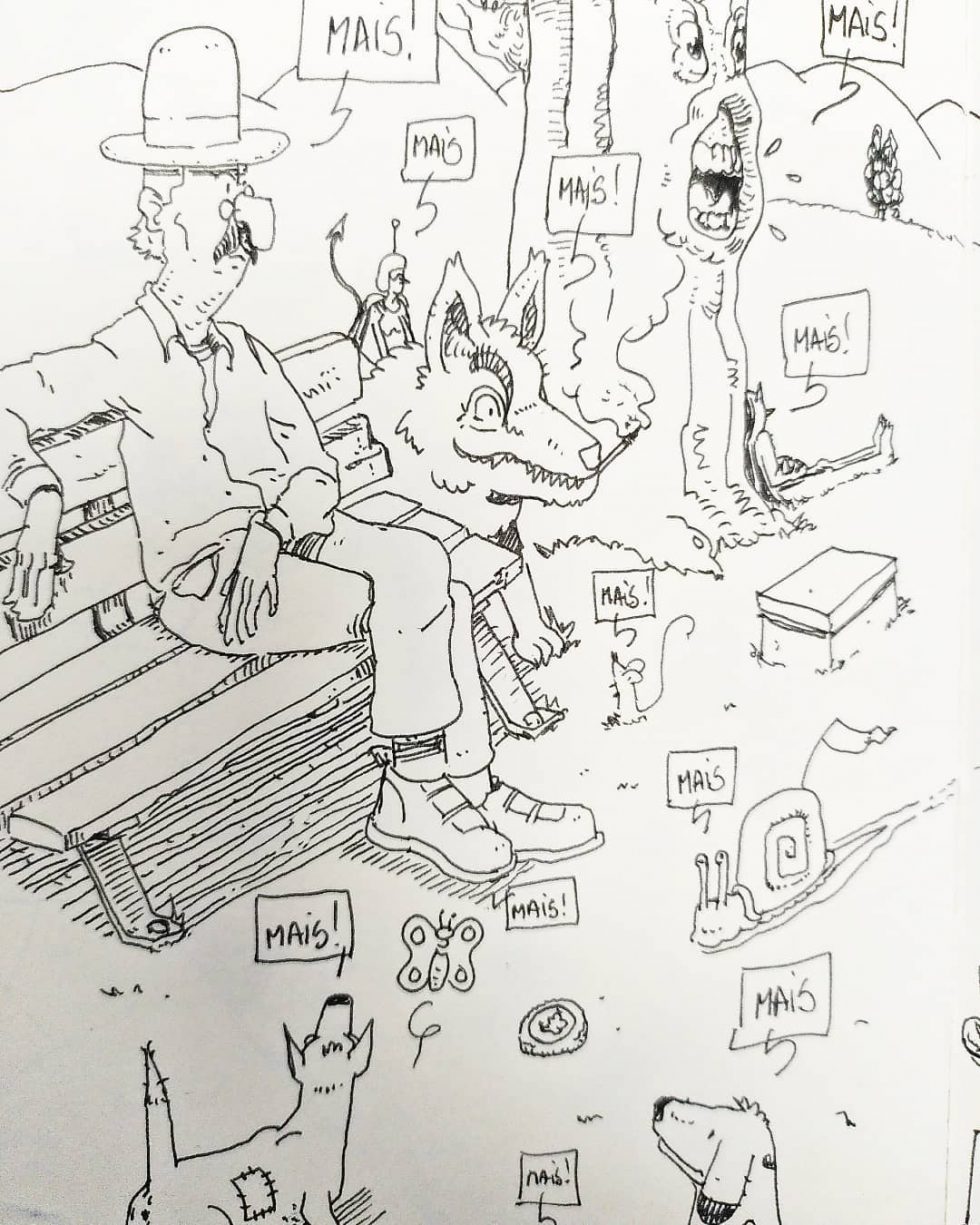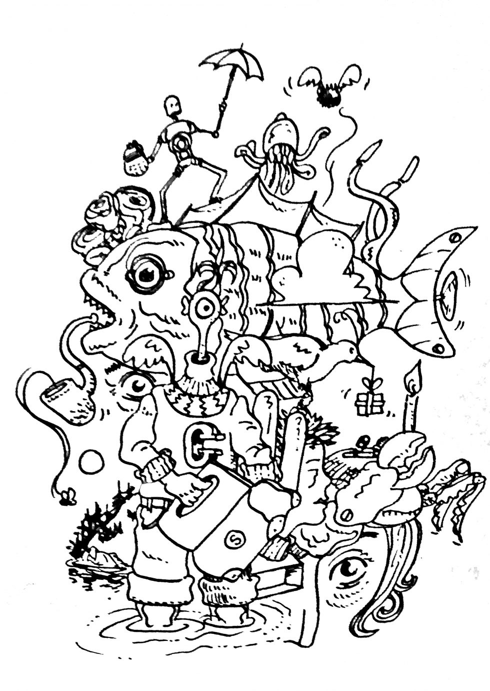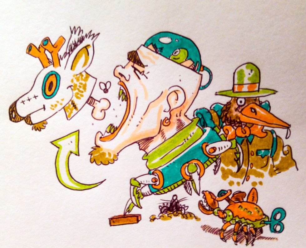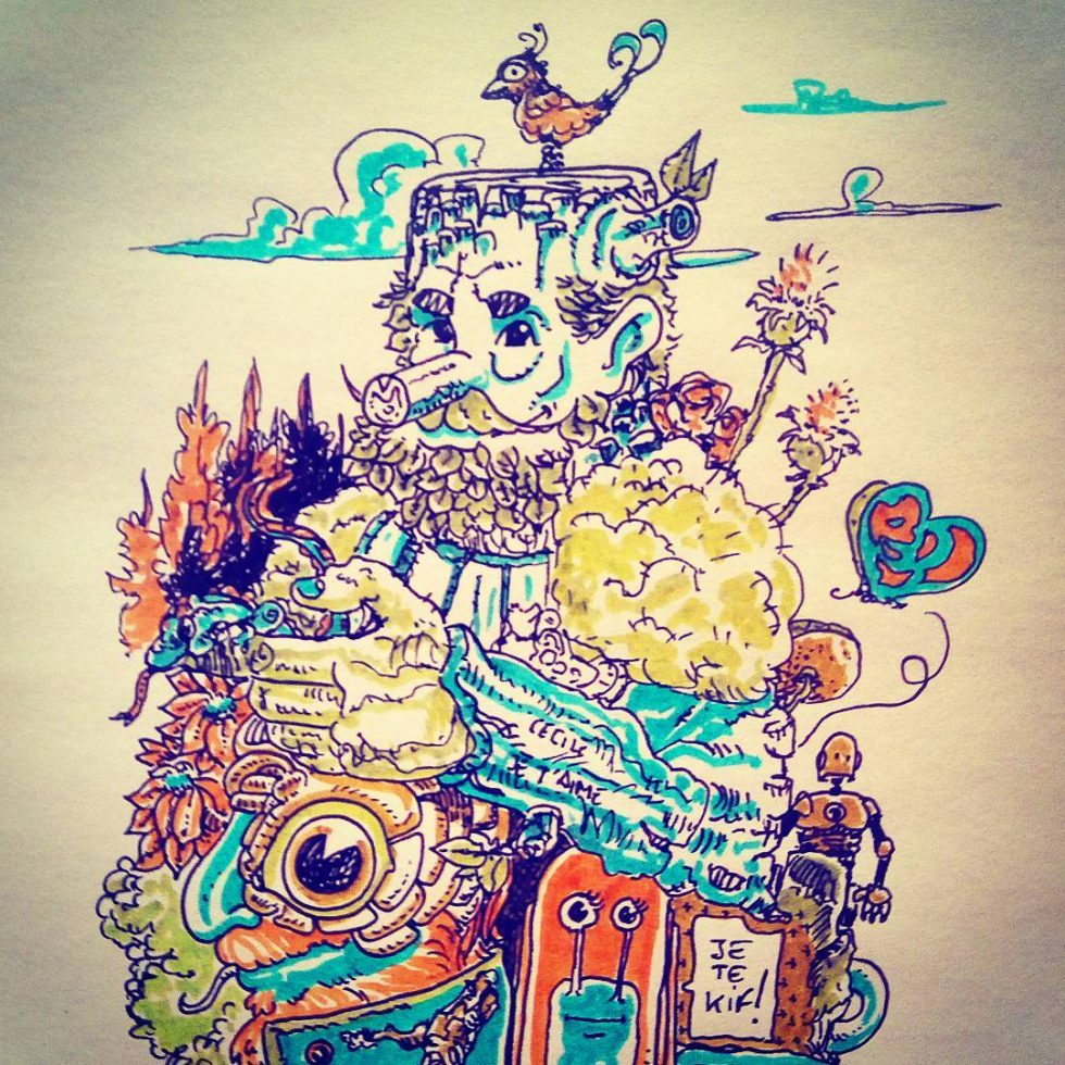 Parfois, il est bon de laisser vagabonder son esprit sans avoir pour objectif de réaliser une illustration ou une bande dessinée. Juste le plaisir de laisser courir le crayon sur la feuille, de tester de nouveaux sentiers graphiques, de laisser libre cours à son foutoir intérieur.